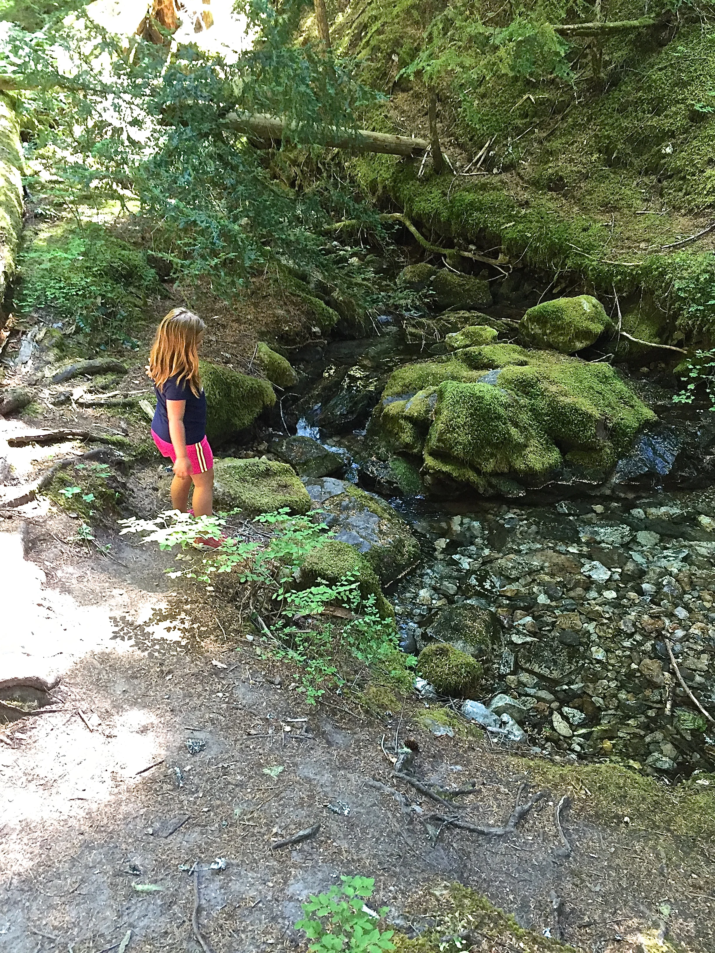 This trail offers very little shade because the first half of the hike is through a sparse forest; regrowth from an old fire. We were all very excited to find a creek half way up that was just right for splashing our faces!